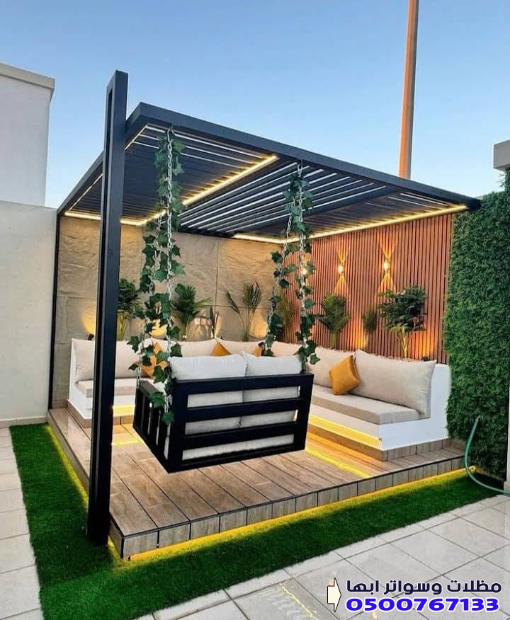 - مظلات حدائق المحالة وهي تضيف أجواء مريحة للجلوس في الهواء الطلق، يمكن تصميمها بشكل عصري باستخدام القماش المشدود أو الخشب الصناعي.
